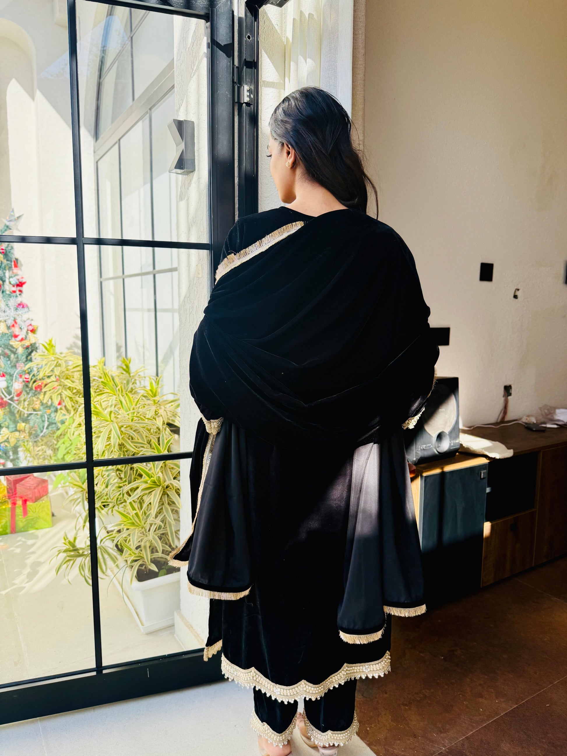 Step into timeless elegance with this luxurious velvet set, featuring a richly crafted kurta adorned with intricate gold lace along the neckline, sleeves, and hem. The ensemble is paired with matching straight pants detailed with delicate scalloped embroidery. A statement velvet dupatta, finished with a shimmering gold border, completes the look—adding regal charm and graceful flow. Perfect for festive celebrations, weddings, and evening occasions. SKU: VLBL04