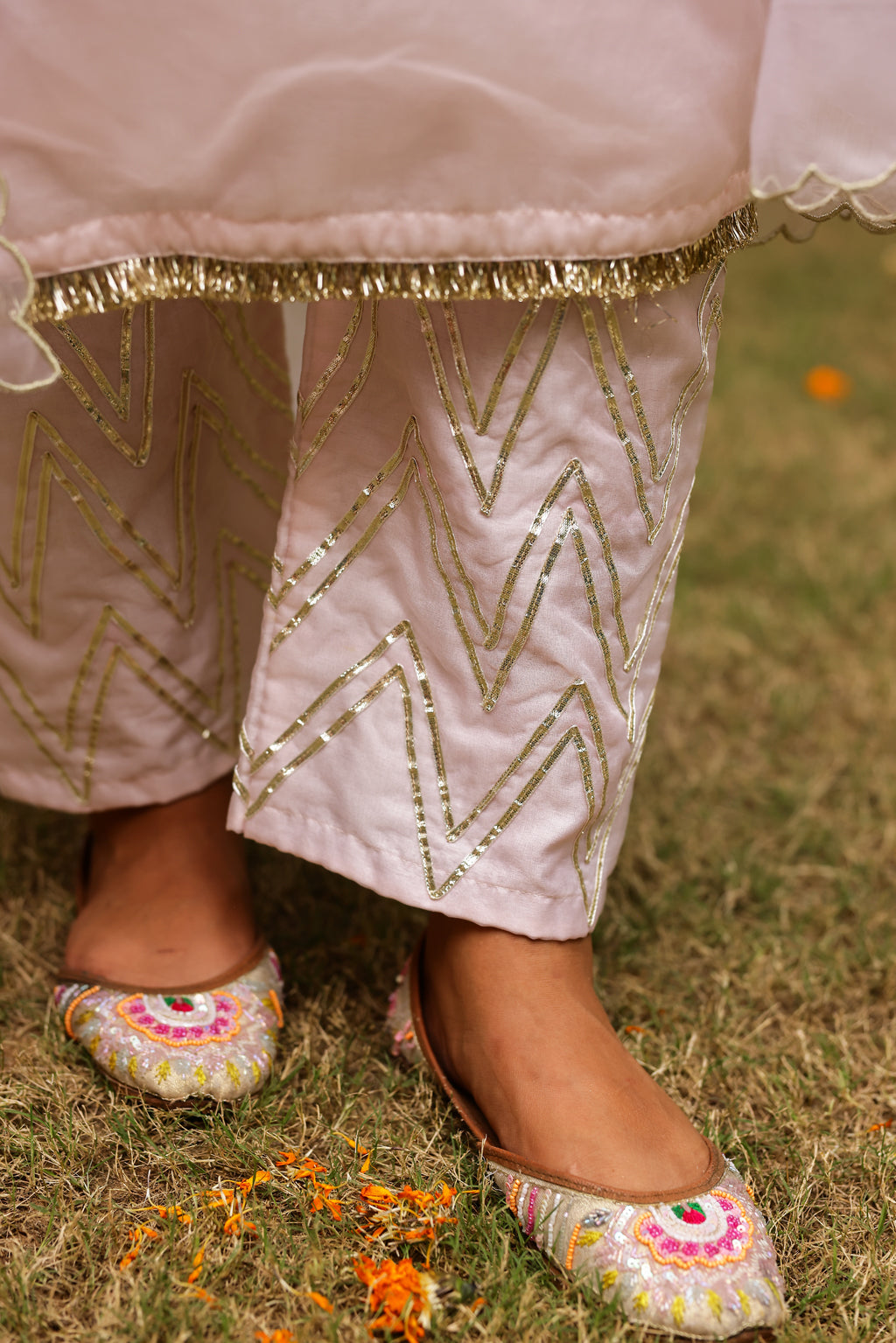 Embrace timeless elegance with our Pastel Pink Organza flared kurta set, designed to blend sophistication with comfort. The kurta features intricate hand embroidery on the neckline and hem, enhanced by soft gathers and a fluid drape that flatter every silhouette. Paired with lightweight organza pants and a dreamy organza dupatta adorned with delicate gota details, this ensemble exudes charm and grace. Finished with a comfortable shantoon lining, it offers a flowing, ethereal feel—making it the perfect choice for festive occasions, family celebrations, and special gatherings.