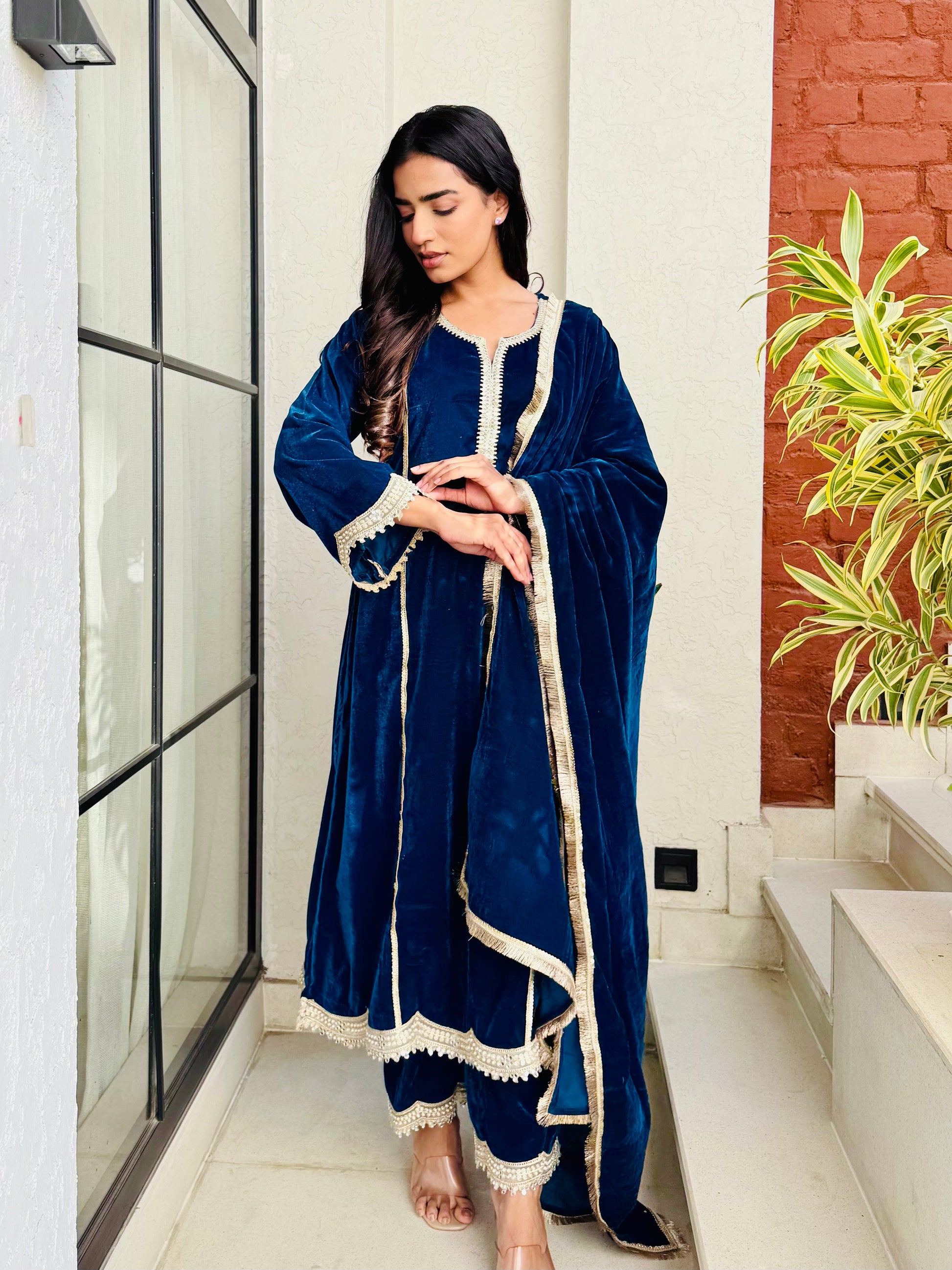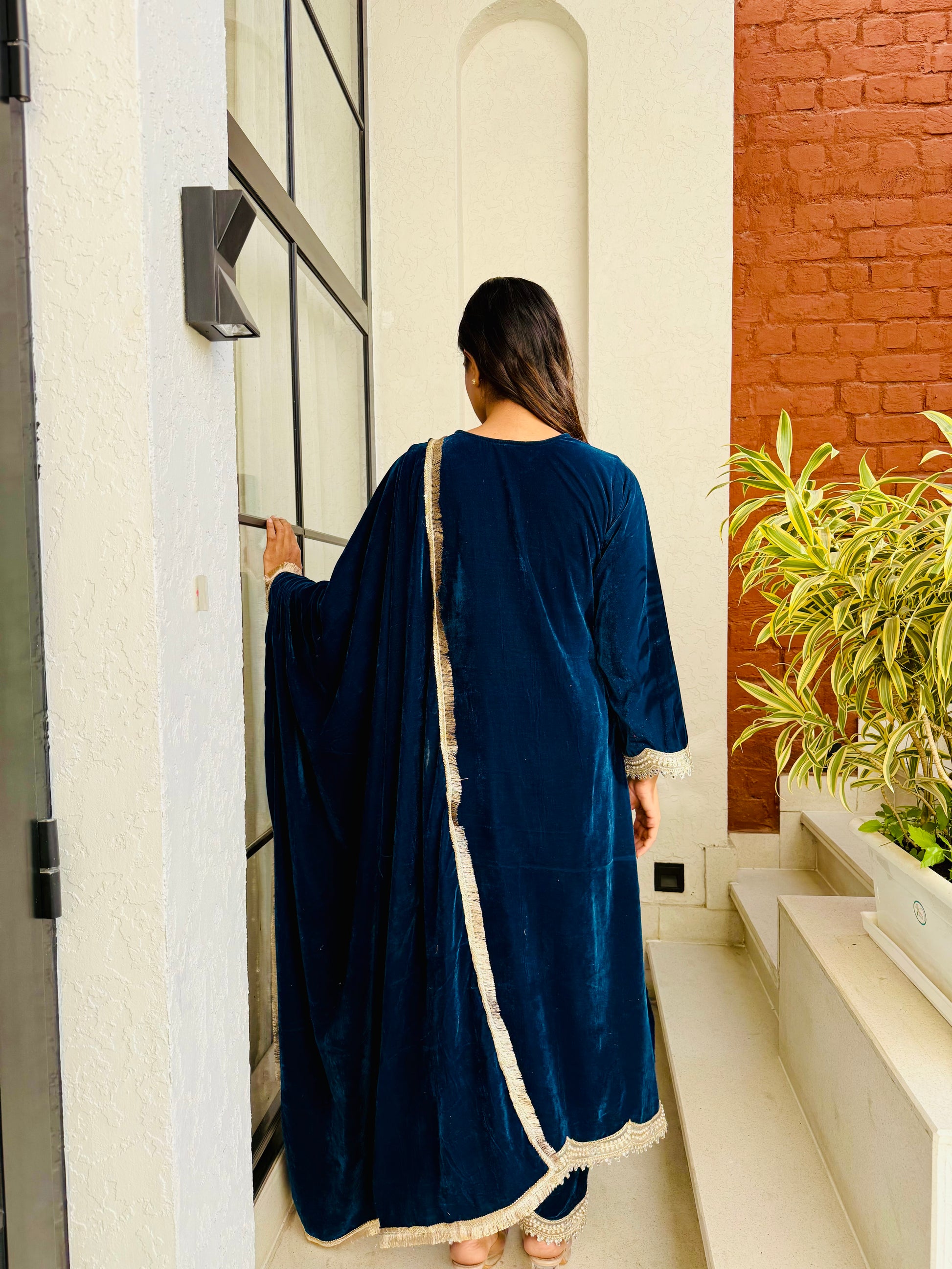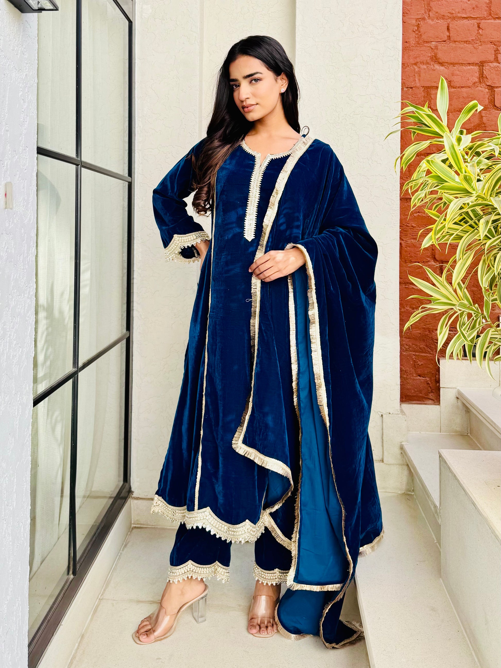 Step into timeless elegance with this luxurious velvet set, featuring a richly crafted kurta adorned with intricate gold lace along the neckline, sleeves, and hem. The ensemble is paired with matching straight pants detailed with delicate scalloped embroidery. A statement velvet dupatta, finished with a shimmering gold border, completes the look—adding regal charm and graceful flow. Perfect for festive celebrations, weddings, and evening occasions.SKU: VLTB05